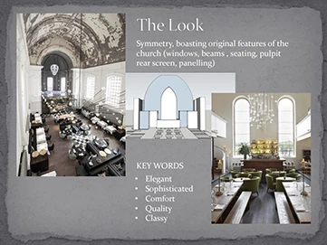 The design highlights the church’s stunning architectural features, such as the arched windows and exposed stonework, pairing them with warm lighting, natural textures, and contemporary furnishings to create an inviting and atmospheric space.